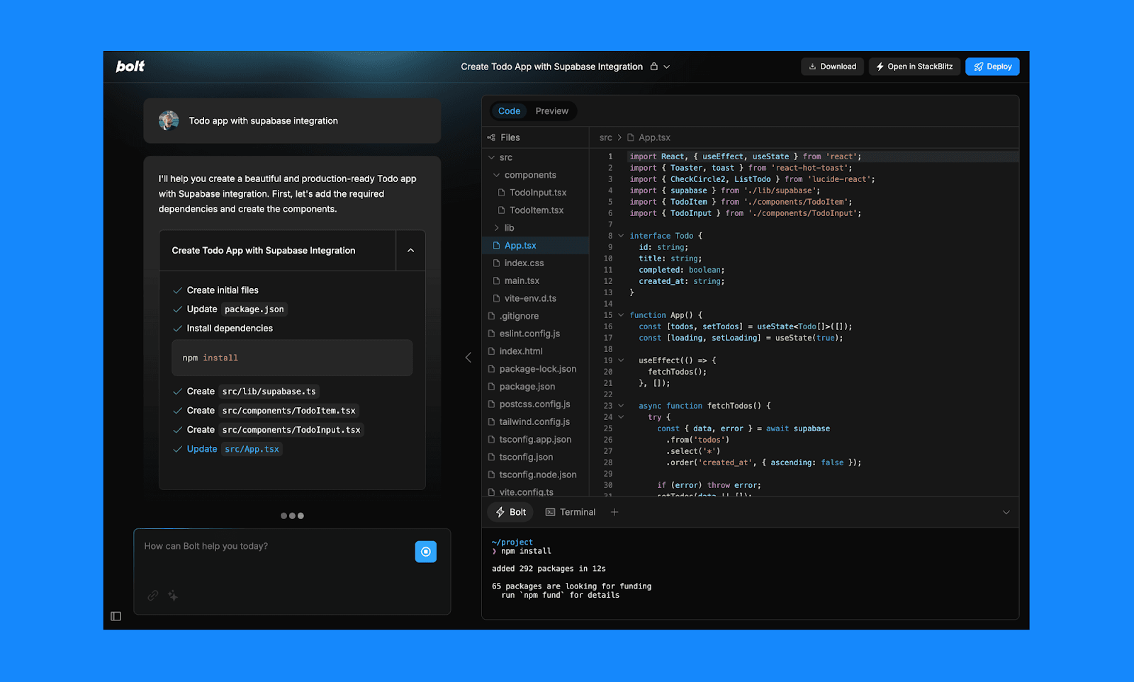 Bolt makes coding faster and easier with real-time feedback, simple setup, and tools that help both beginners and experts build projects quickly.