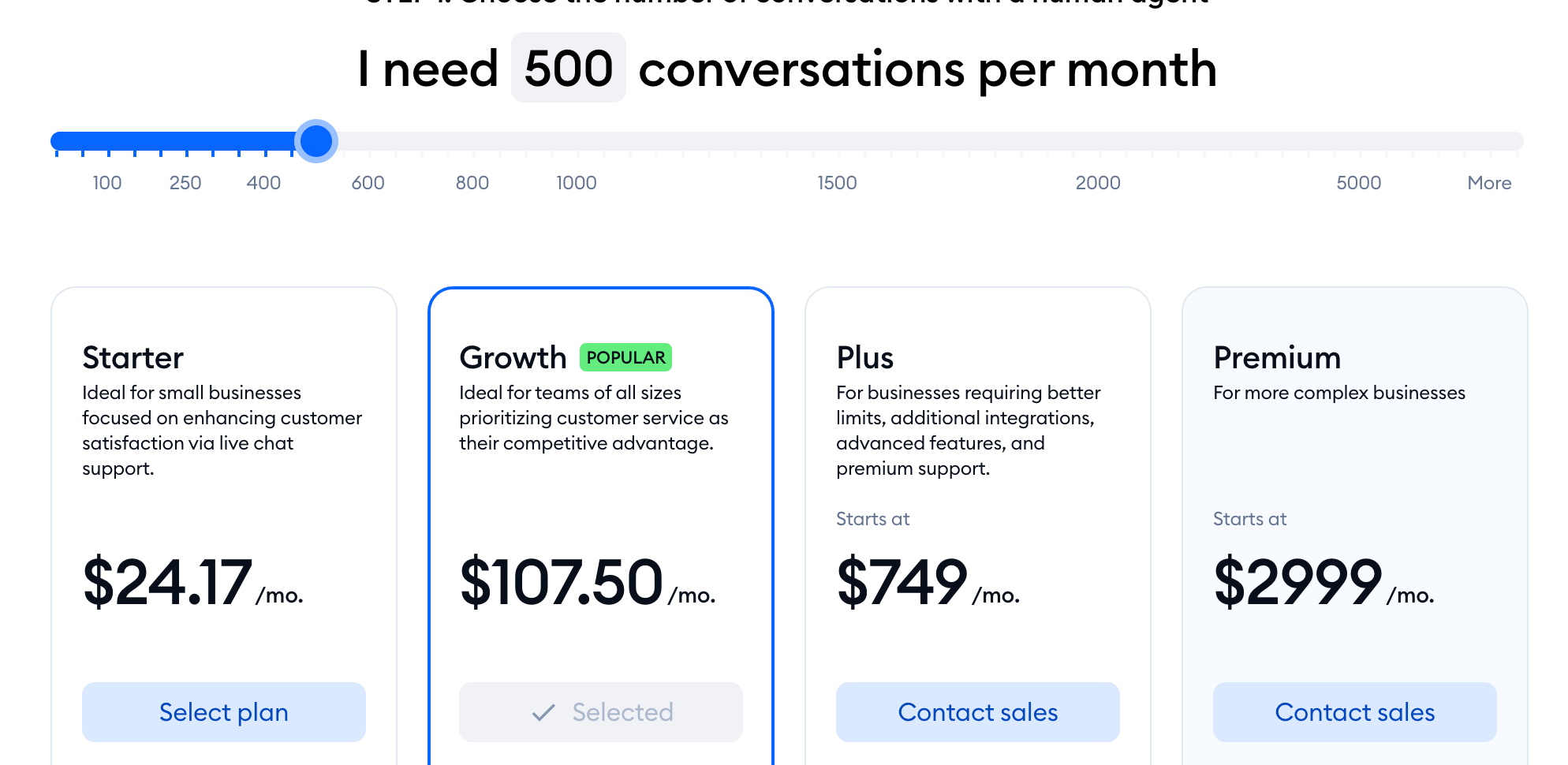 Affordable pricing tiers designed to get you started quickly. You get unlimited user conversations, so you don’t need to worry about accidentally going over budget or cutting off your most-engaged visitors.