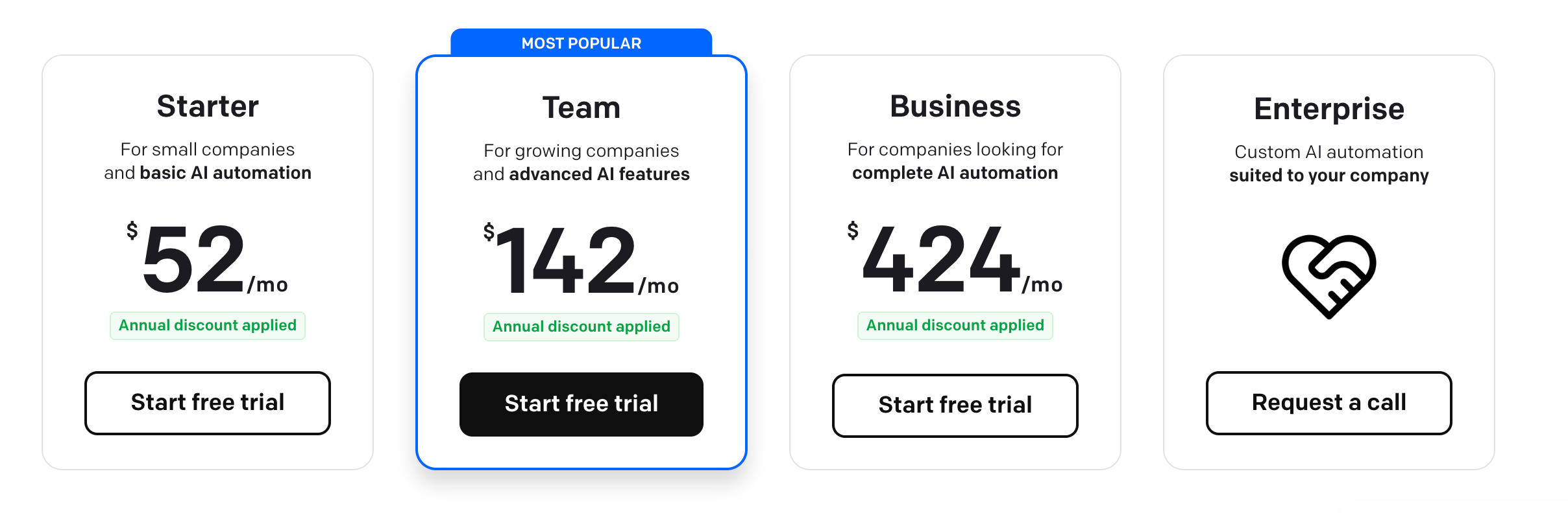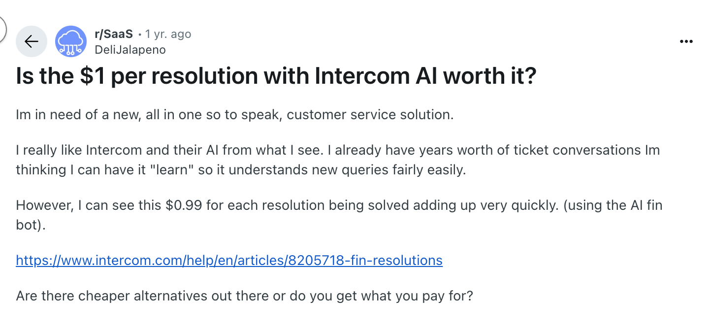Intercom has recently switched from a seat-based pricing model to a hybrid with a base seat price and extra cost for each resolution, likely to cover AI costs: