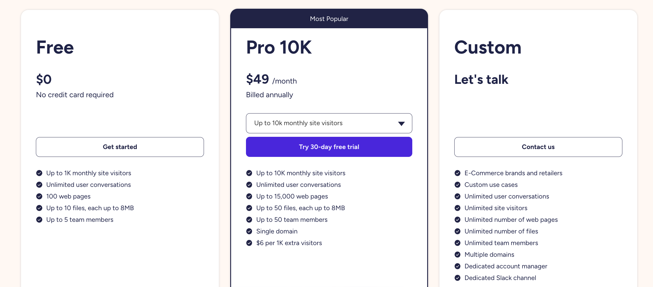 Pro 10K - $49/month (billed annually), supports up to 10,000 monthly site visitors, unlimited user conversations, 15,000 web pages, 50 files (8MB each), 50 team members, and one domain. Additional visitors at $6 per 1,000.