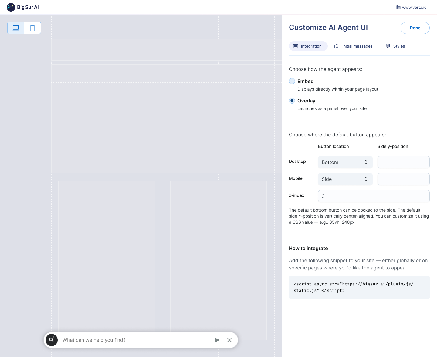 Big Sur AI has the unique ability to be integrated both as a regular chatbot on the X or Y axis of any web page, but also in custom website components, like under product descriptions or next to buttons ⤵️