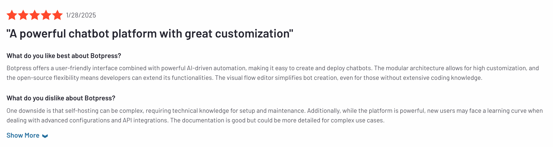 While Botpress offers flexibility, self-hosting the platform can be complex and may require technical expertise for setup and maintenance. Users have noted challenges in configuring and managing the platform independently.