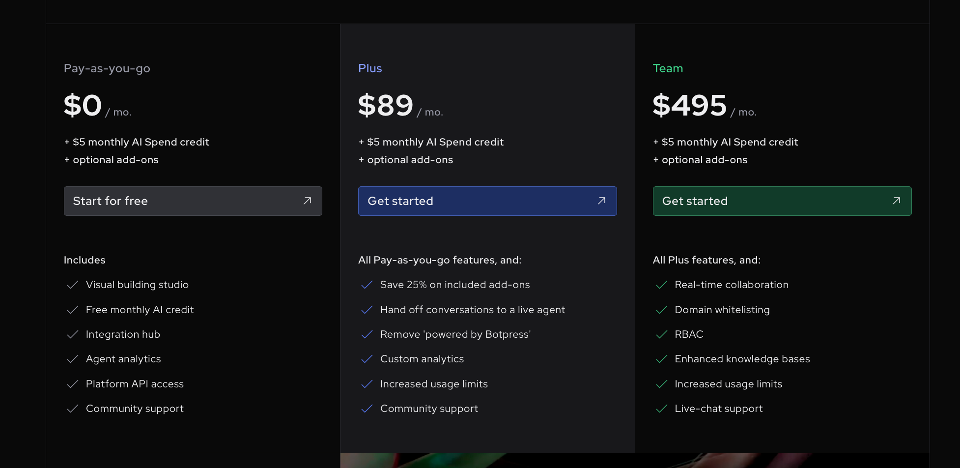 Botpress’s pricing varies by volume. The company sets limits for evey single factor affecting pricing, like the number of bots, seats, messages, or rows in a given bot.