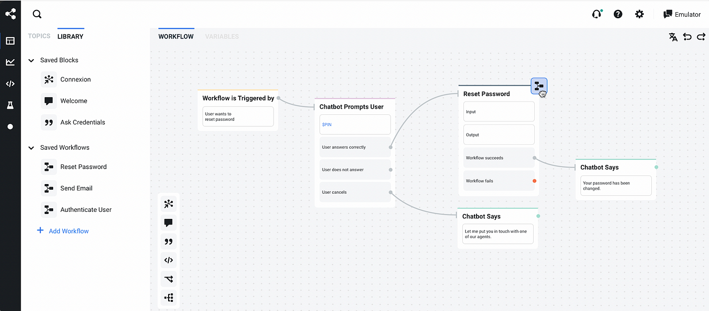 The platform includes a visual drag-and-drop interface for designing conversational flows, making it accessible for users without extensive coding experience. This feature simplifies the creation and management of complex dialogues.