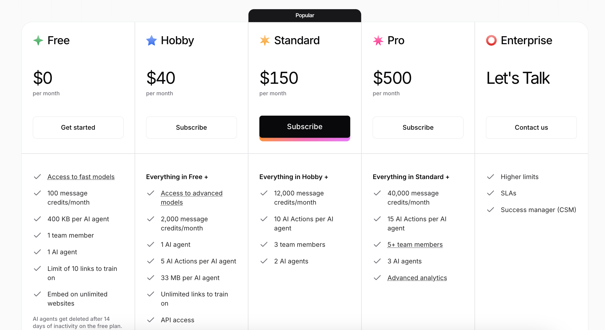 Chatbase plans vary primarily in message credits, number of AI agents, team members, AI Actions per agent, analytics access, and advanced features. Pick from 4 plans: