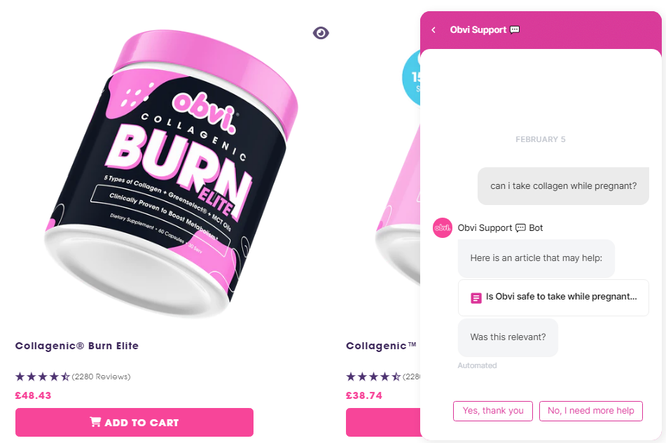 Example: Obvi can manage over 150 customer support tickets daily by using an AI chatbot to answer common customer problems.