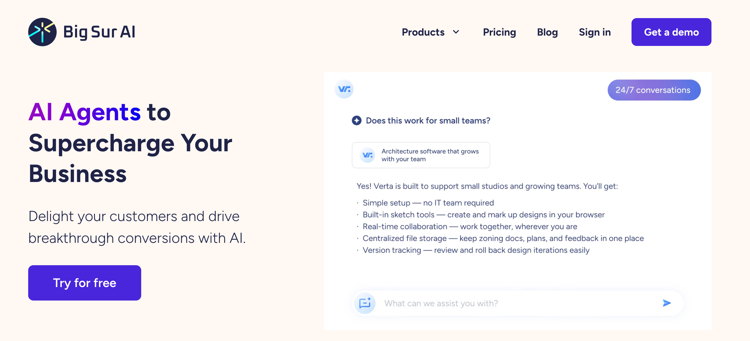 Big Sur AI is built from the ground up to crawl, understand, and sync with your website's content automaticallyâno manual setup. Within minutes, it launches a personalized AI agent that can reside anywhere on your site (product pages, CTAs, etc.)