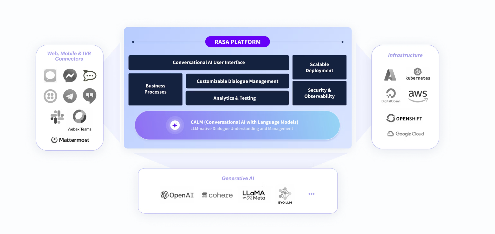 Compared to competitors, Rasa offers fewer native integrations with popular messaging platforms, CRMs, and analytics tools. Expanding Rasaâs capabilities typically requires building custom connectors, adding complexity and development overhead for organizations wanting easy cross-platform support.