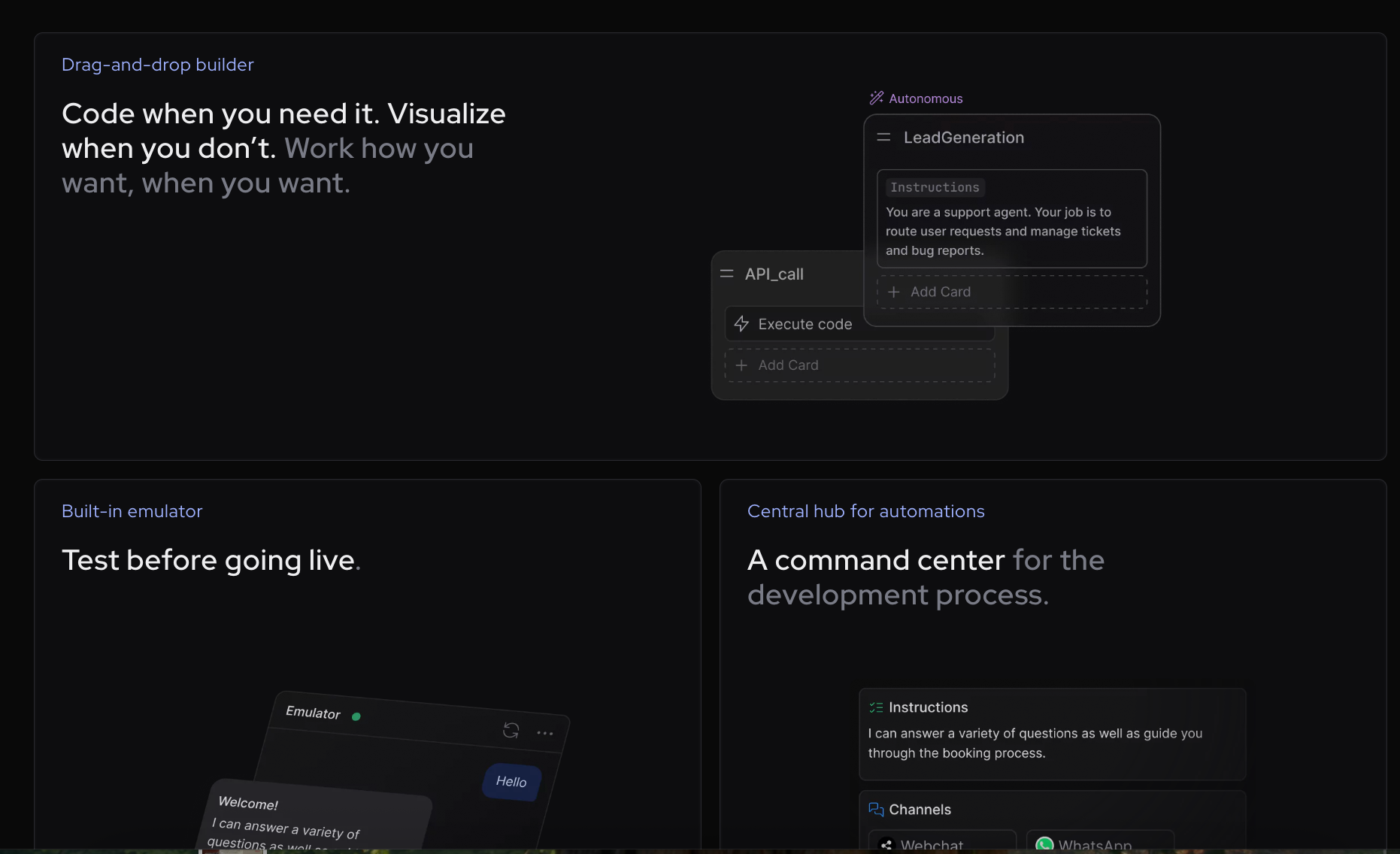 It lets you design, deploy, and manage chatbots and virtual assistants using visual flows and modular building blocks integrated with your existing APIs and NLU models.