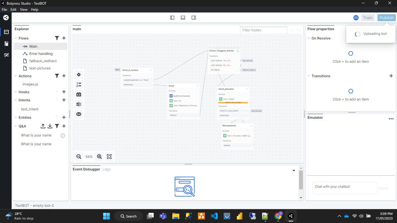 Botpress lets you deploy bots across major channels out of the box, including web, Facebook Messenger, Microsoft Teams, Slack, and WhatsApp. The prebuilt connectors handle channel-specific formatting and events, so you can reuse one bot logic and maintain consistent interactions regardless of where users engage. It reduces the burden of handling channel quirks and speeds up time to go live.