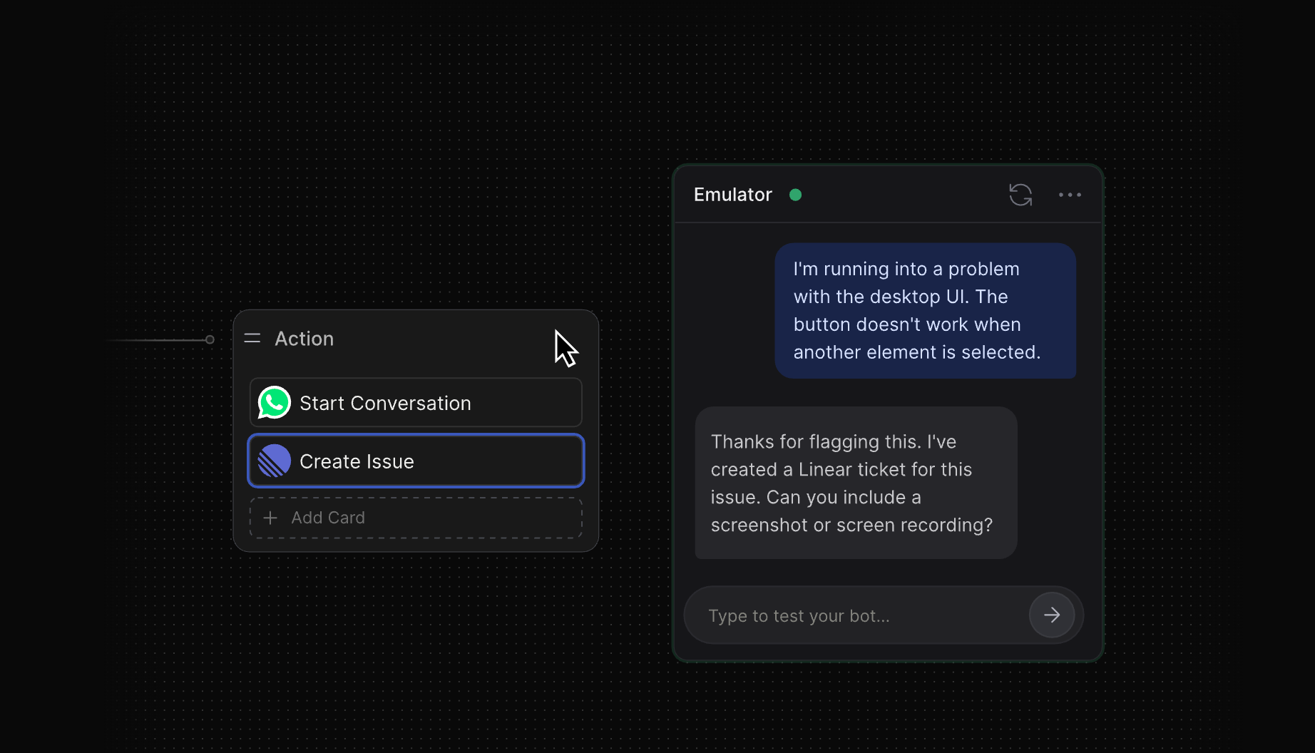 Botpress's drag-and-drop visual flow builder empowers teams to design complex, multi-turn conversations without code. You can define conversation logic, add conditional branches, and manage context visually. This makes prototyping, debugging, and iterating on flows highly efficient, especially for teams that need to collaborate across technical and non-technical stakeholders.