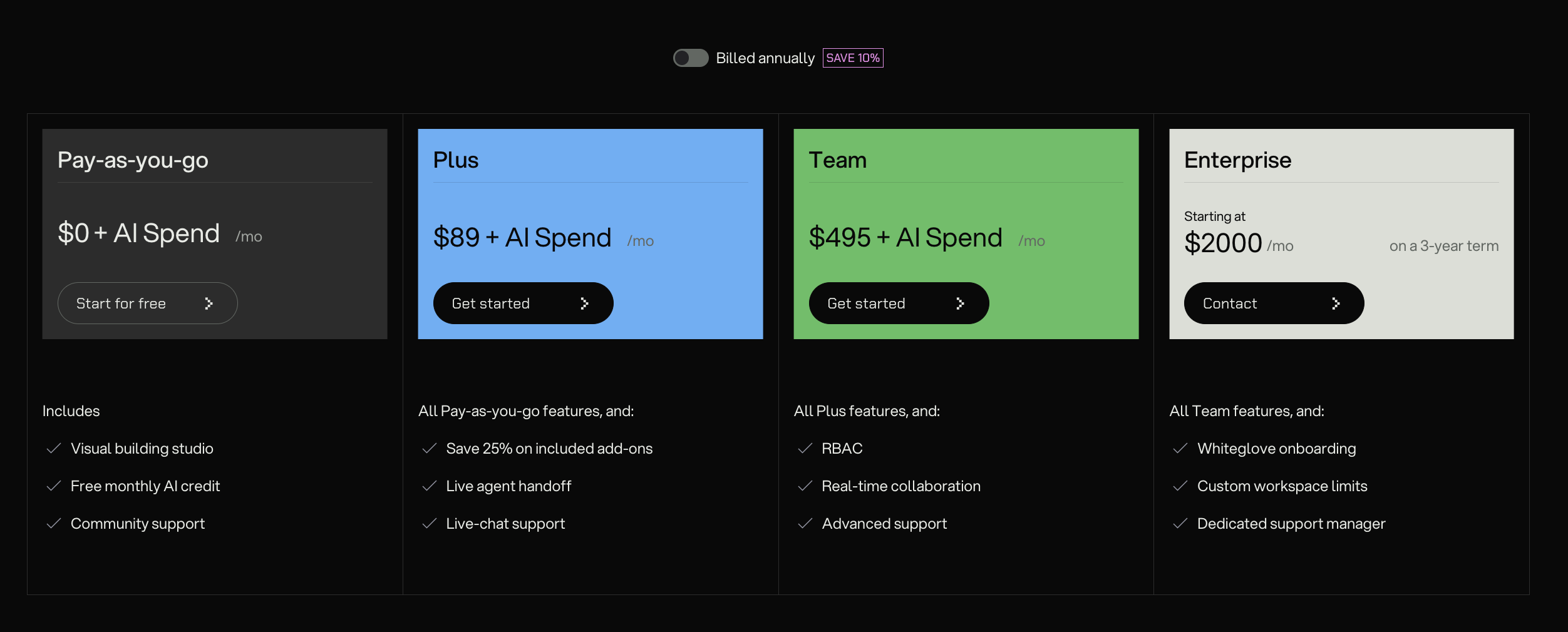 Botpress uses a usage-based subscription model split across four plans with variable monthly AI spending and workspace limits.