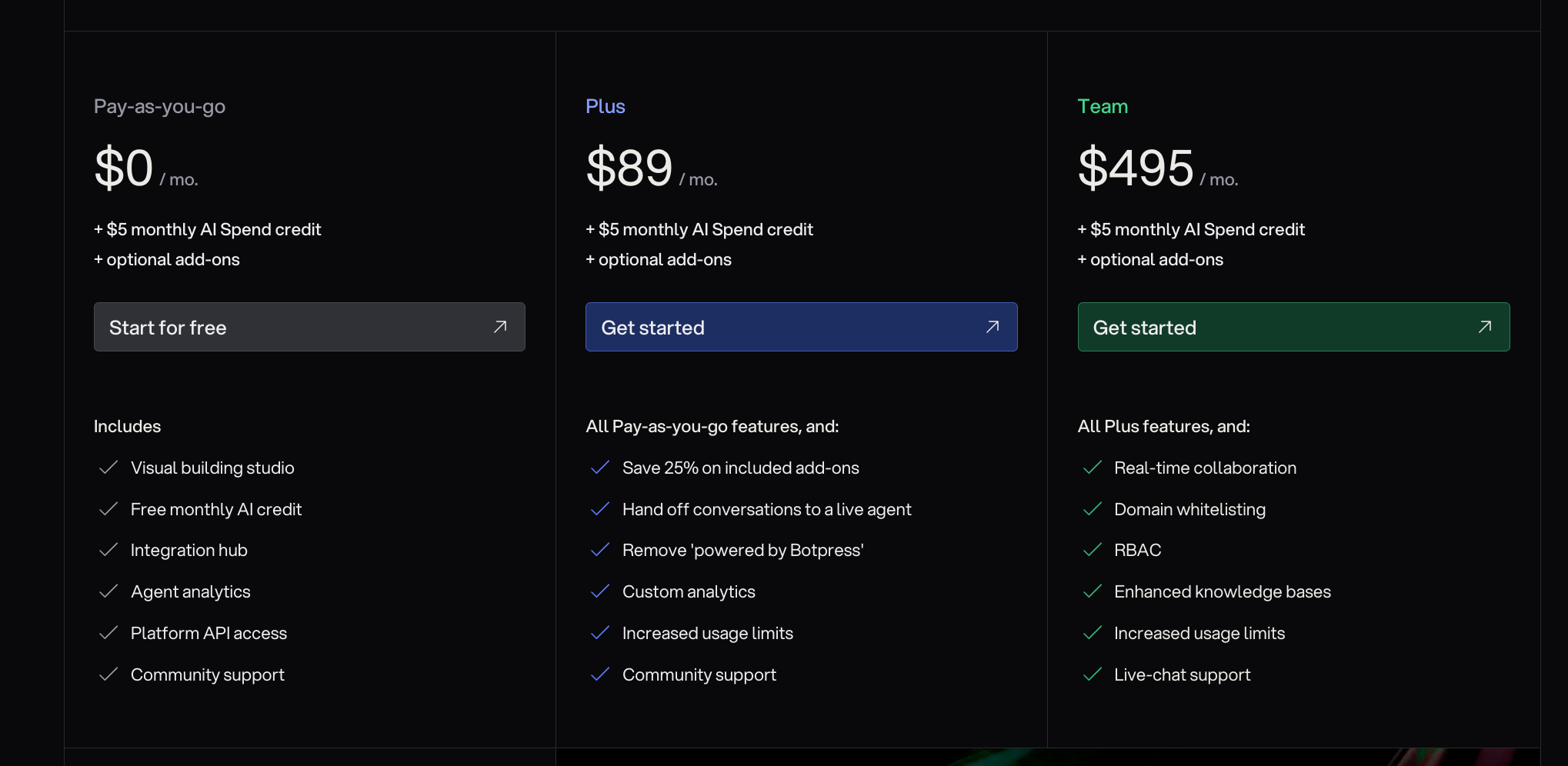 | Botpress | $0/$495/Custom | 1K messages/mo, 1 bot, Botpress branding | Pay for each message over plan limit | Large leap in price to Pro, enterprise features at custom price |