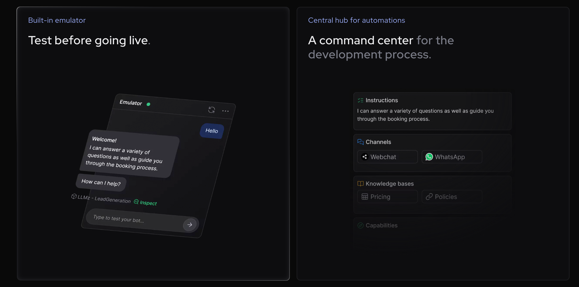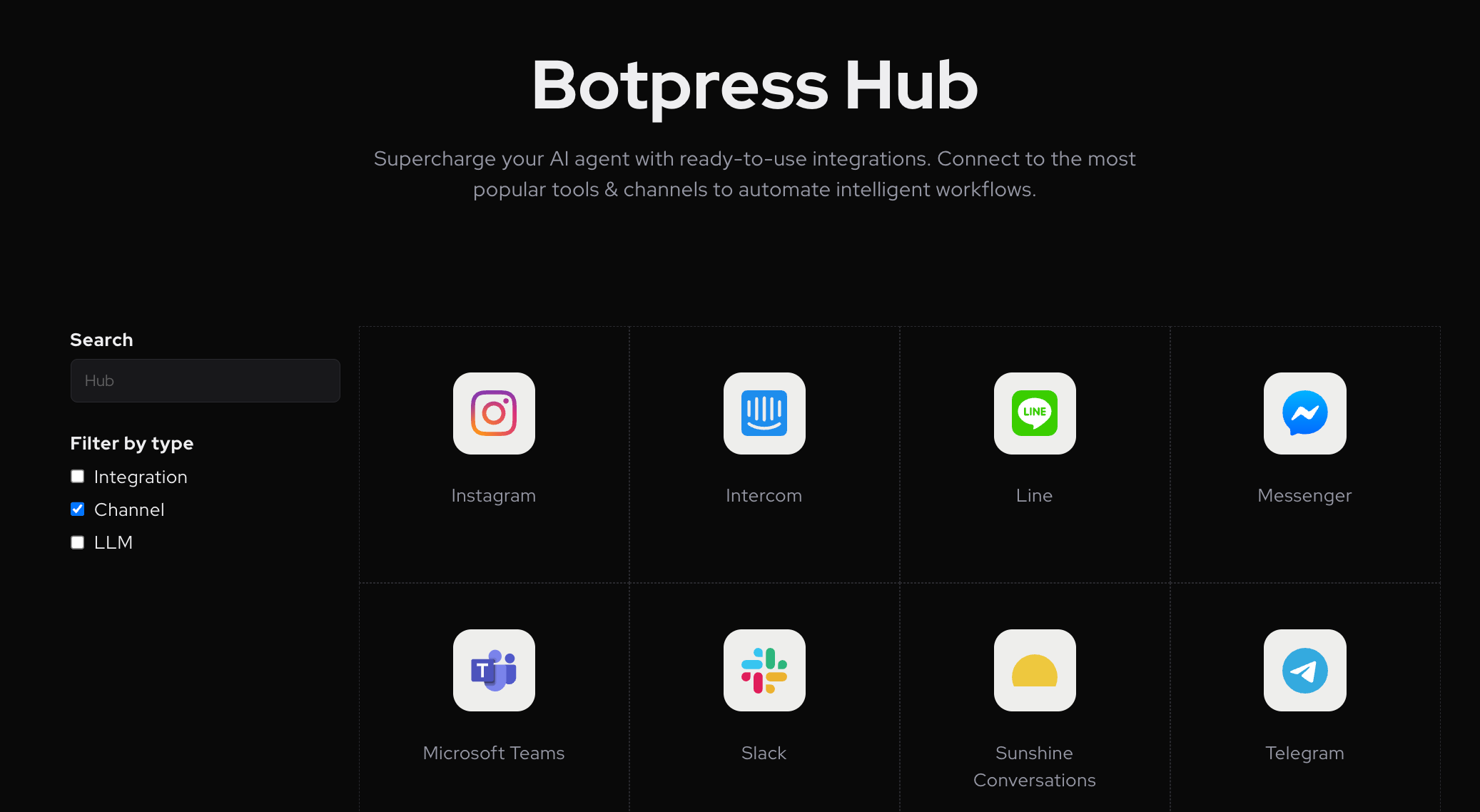 Deploy across web, mobile, messaging platforms like WhatsApp, Slack, Teams, and more. Botpress supports both cloud and self-hosting (open source/on-prem)—ideal for enterprises needing data control or custom environments.