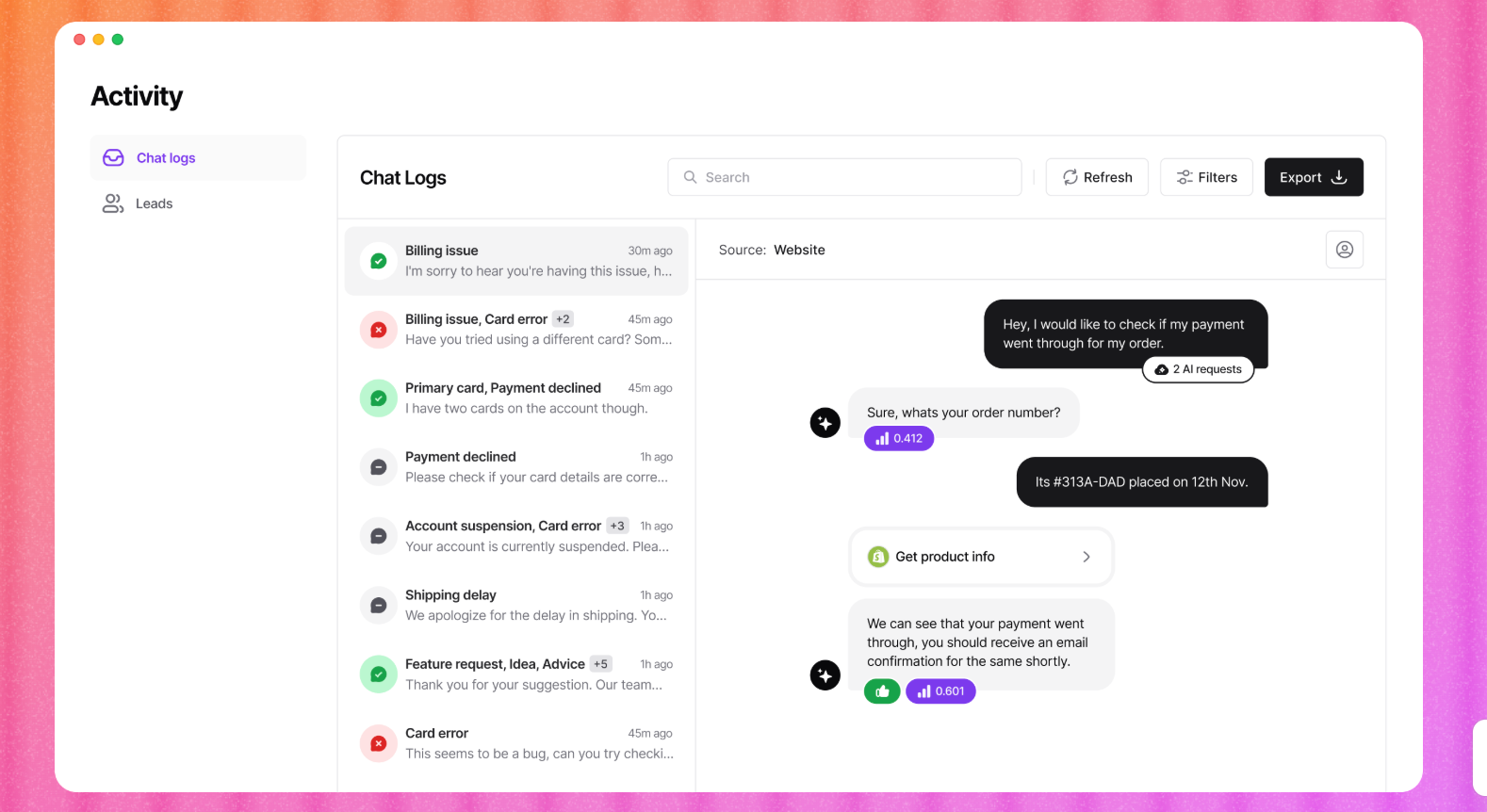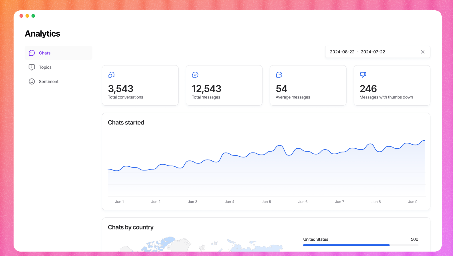 Built-in chatbot performance analytics and user feedback tools help you improve your bot without third-party add-ons.