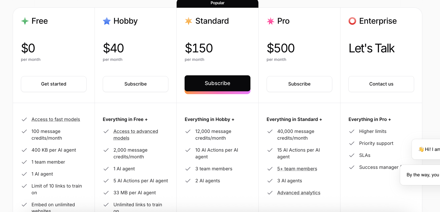 Chatbase’s plans start at $19/month, making it accessible for startups and small businesses. Pricing is clear and based on the number of bots, messages, and training data — with options up to $399/month for larger operations.