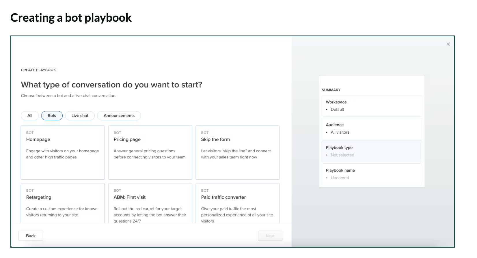 Jump into the Playbooks section to define automated conversations that capture visitors’ intent and route them to the right resource ⤵️