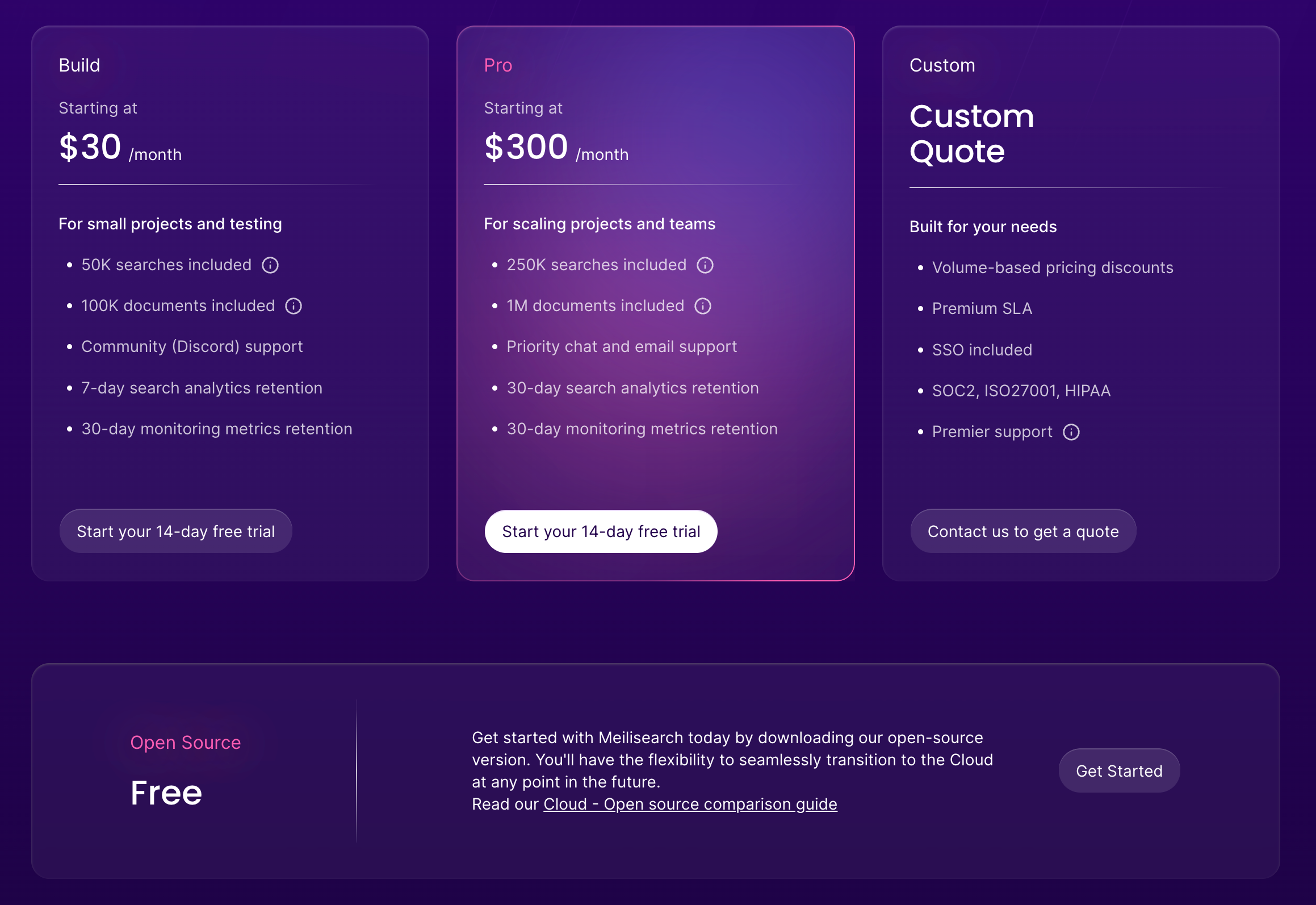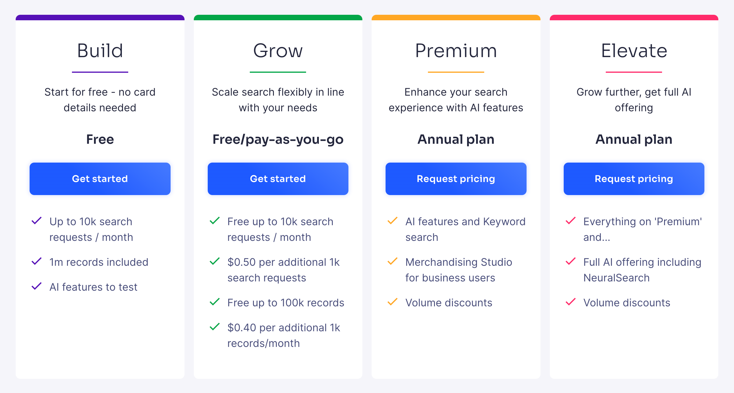 You can begin using Algolia for free then change to any of its yearly or pay-as-you-go plans as your needs expand.