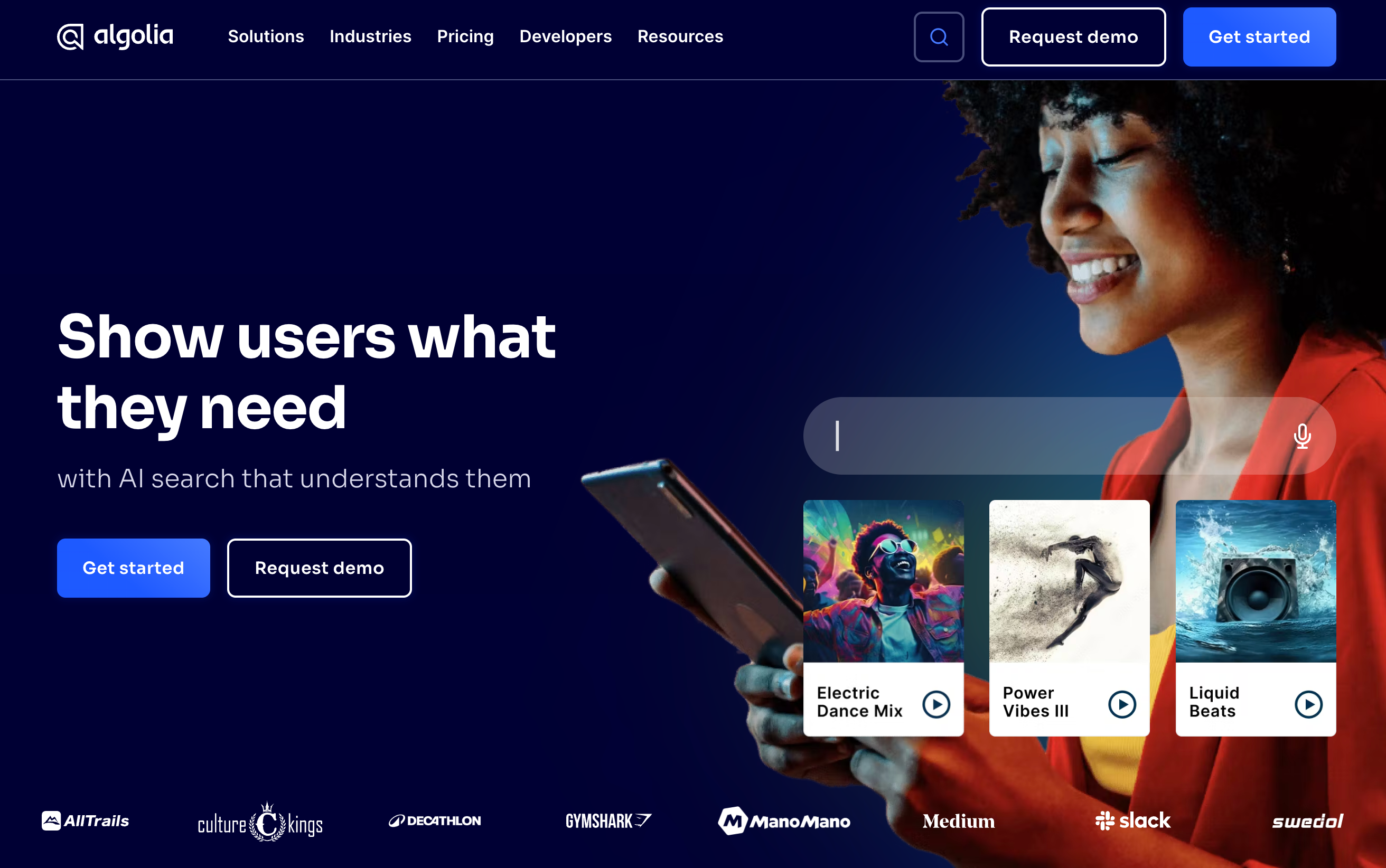 Algolia works great for various business types, from B2C and B2B e-commerce brands to marketplaces, media companies, and SaaS solutions.