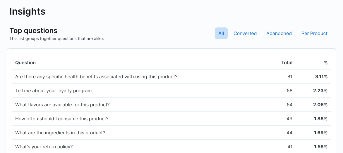 Big Sur AI provides a wide range of performance analytics and chat insights you can use to optimize your store.