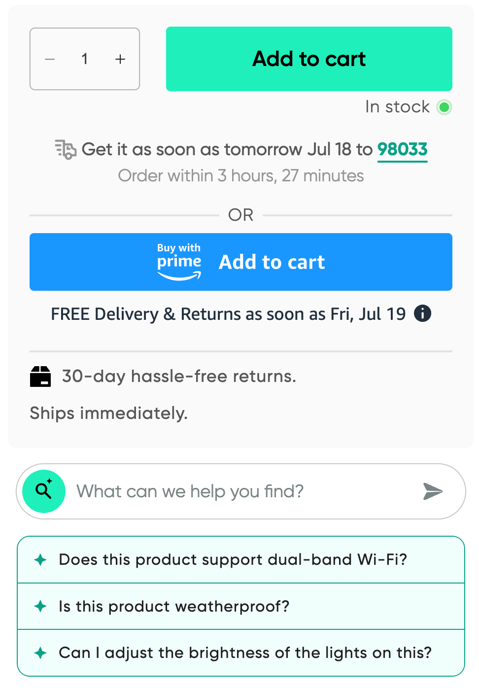 These AI prompts (also called AI corners) are modules of suggested questions that Big Sur AI helps you embed on product and category pages.