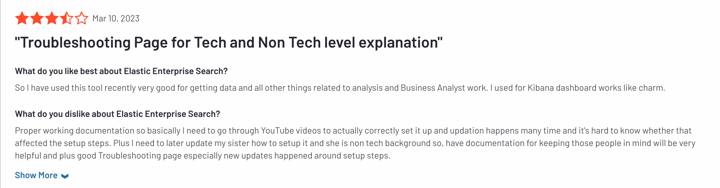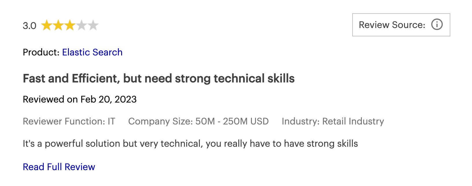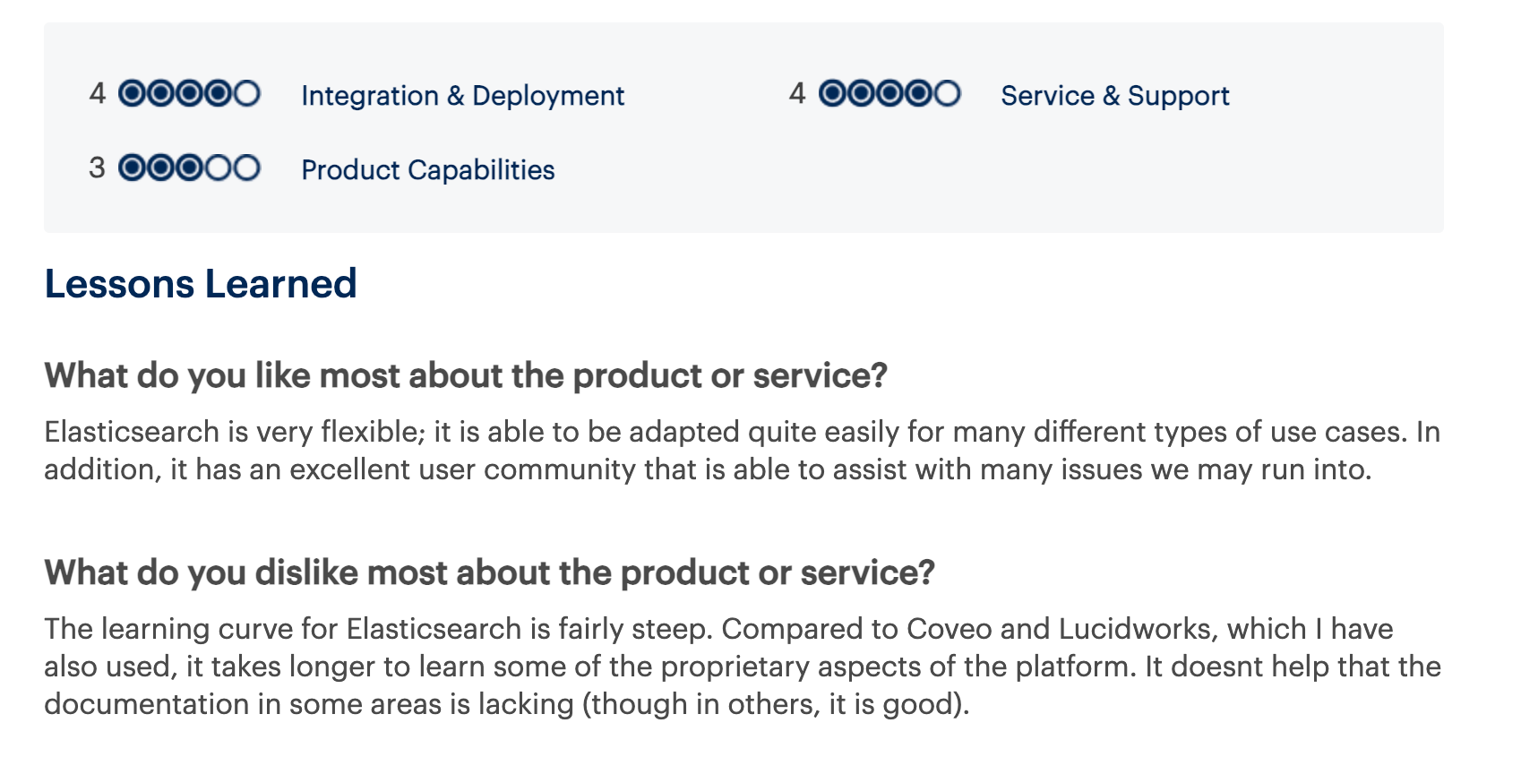While the product is powerful, it does require more back-end search expertise and developer support. Elasticsearch customers often complain about the heavy planning and optimization it needs, especially at scale.