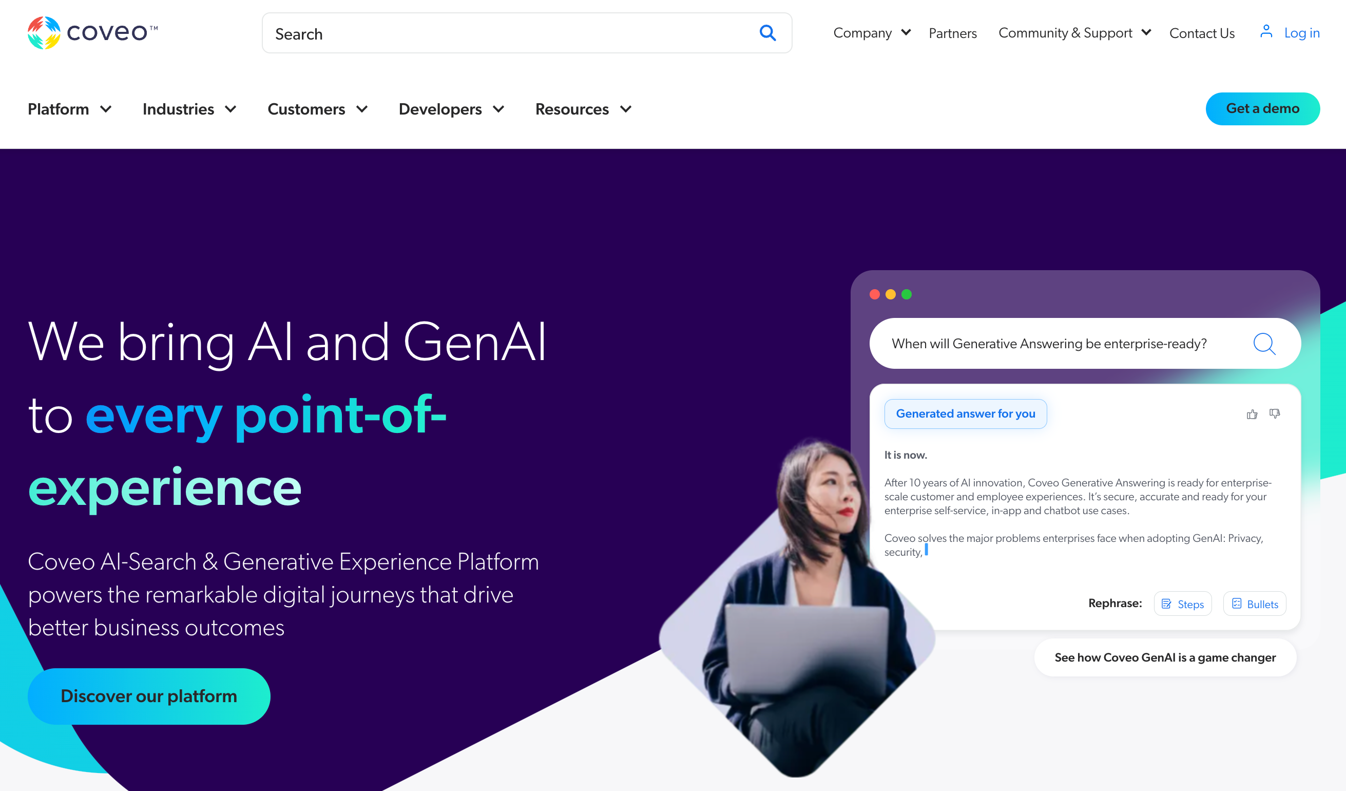 Coveo provides an enterprise search tool and AI personalization software for multiple industries. It helps you give customers and employees relevant and personalized digital experiences.