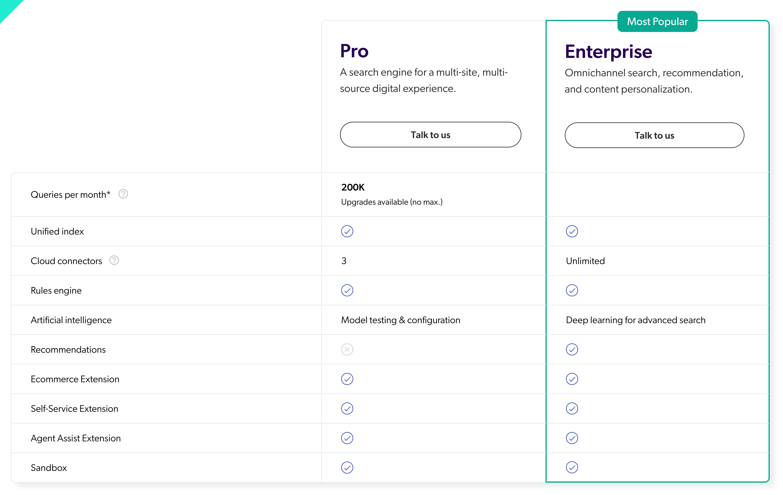 Coveo has two pricing plans: Pro (basic) and Enterprise (advanced).