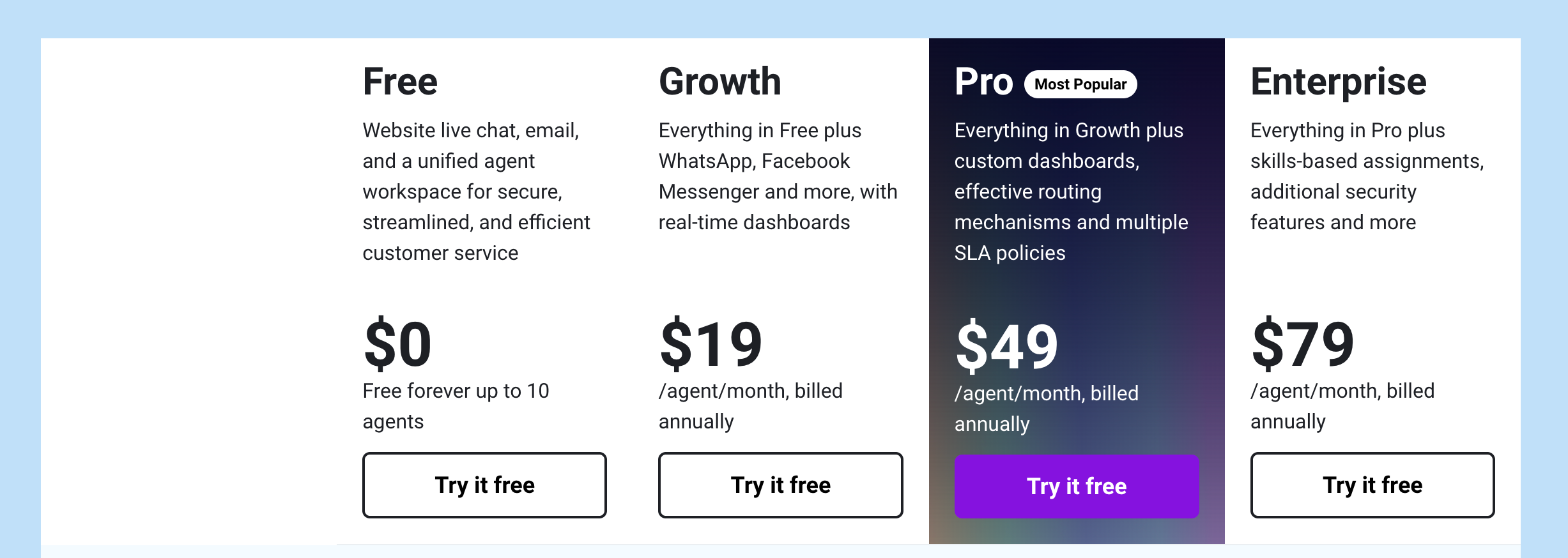 | Enterprise | $79/agent | 25,000 bot sessions, custom roles, more analytics, SLA management, priority routing, advanced AI features |