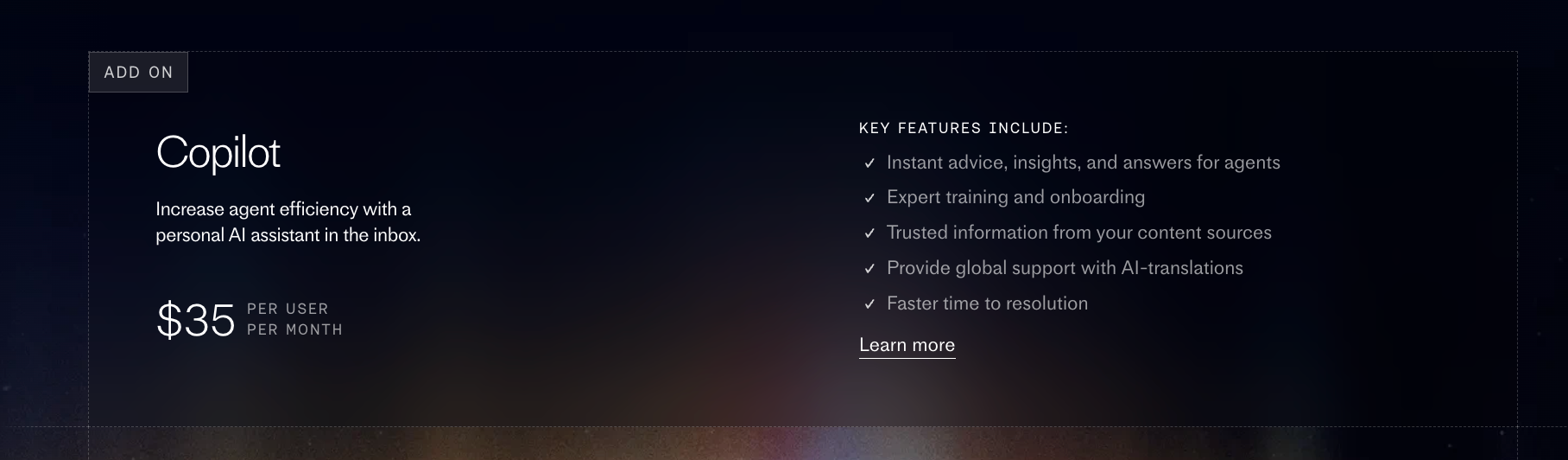 Fin.ai offers one add‑on: Copilot, an AI assistant for agents. Use it to boost staff efficiency with real-time answers and insights.
