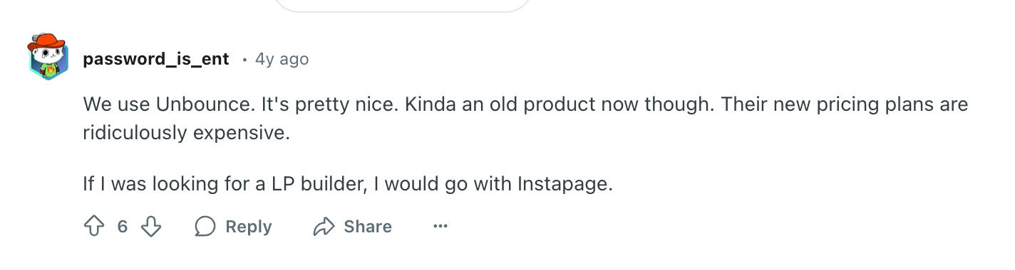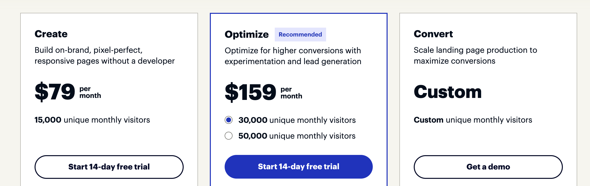 Unbounce’s lowest-tier plan starts at $99/month, which is higher than many competitors. And pricing is based on traffic volume (unique visitors), so costs can grow quickly if your site scales.