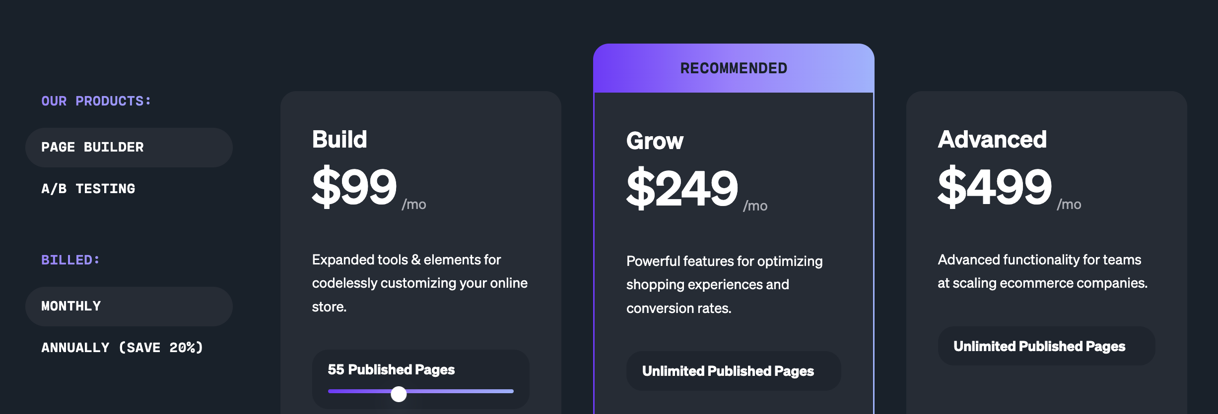 For landing pages, Shogun offers three pricing plans with a 20% discount when billed annually: