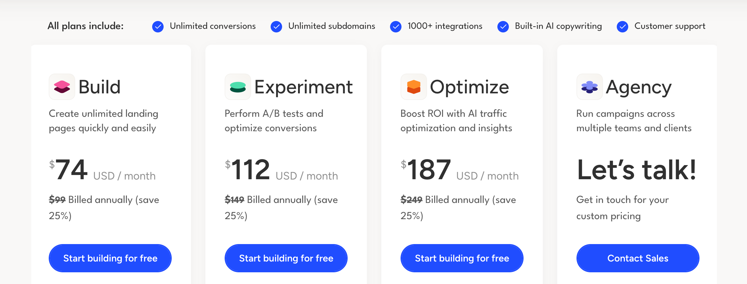 Convert (Custom Pricing): Offers all features from the Optimize plan plus enterprise-ready platform capabilities, ad-to-page personalization, global blocks, heatmaps, direct lead bypass, and more.