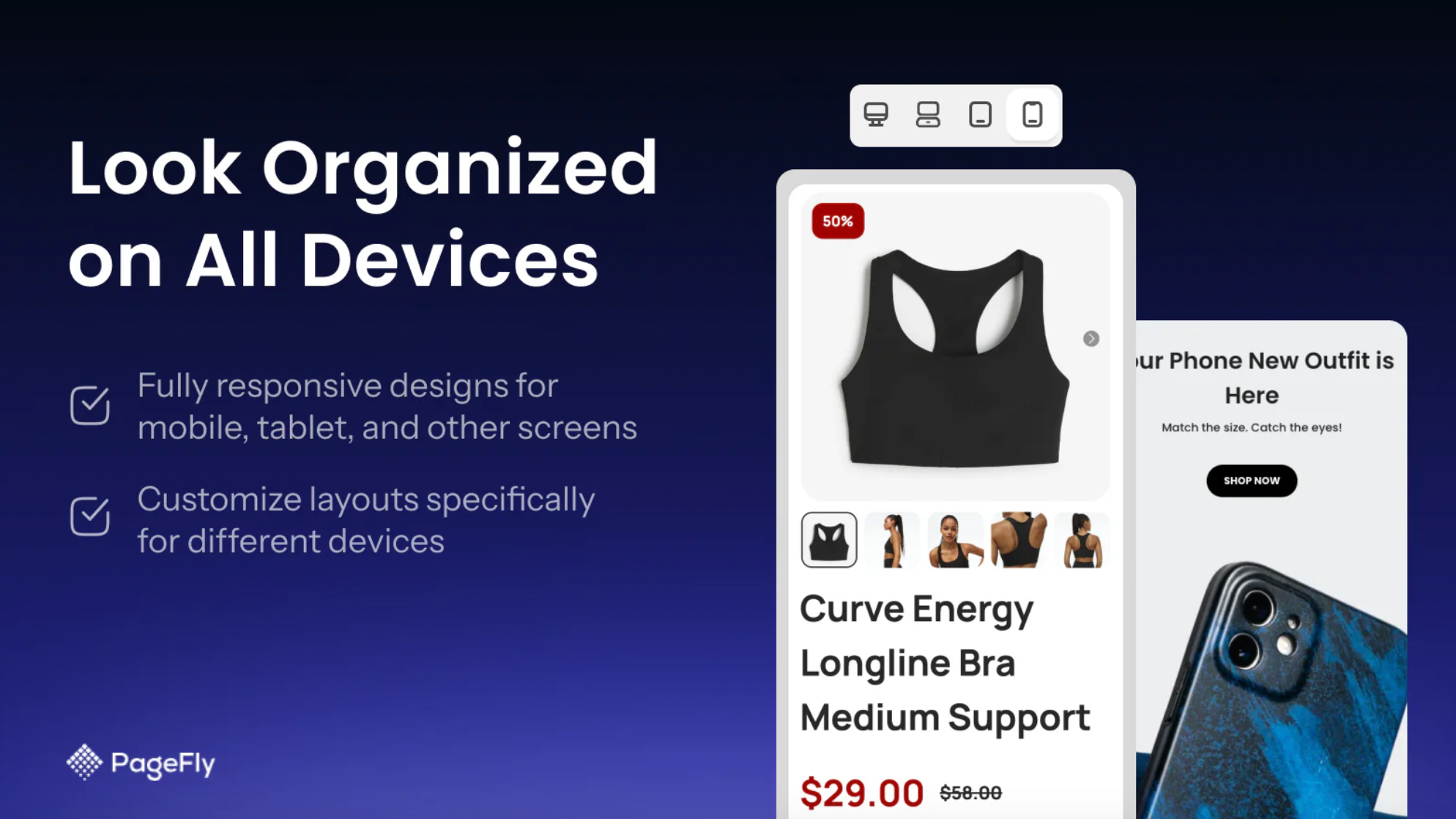 Design pages specifically for mobile, tablet, and desktop views independently. You don’t have to guess how your page will render—PageFly gives you complete responsive control.