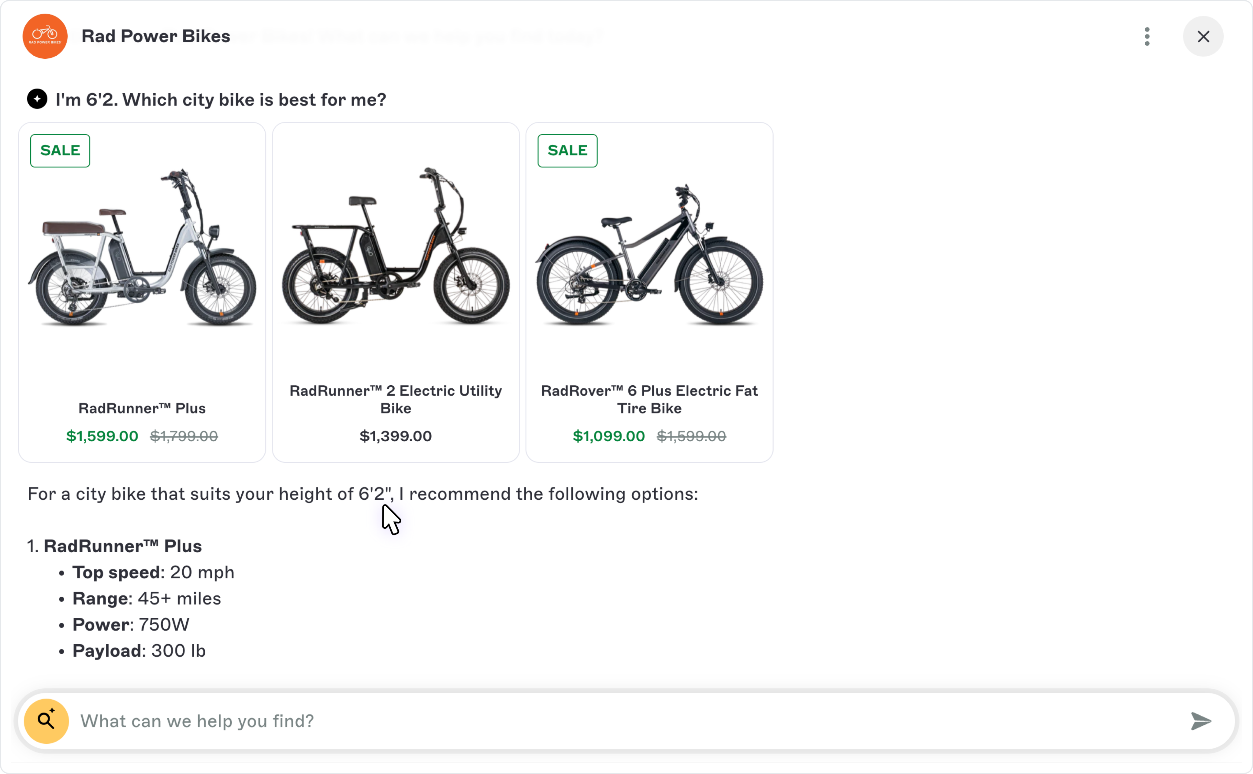 The AI agent can be placed on any page and edited to match your brand style (see example below ⤵️).
