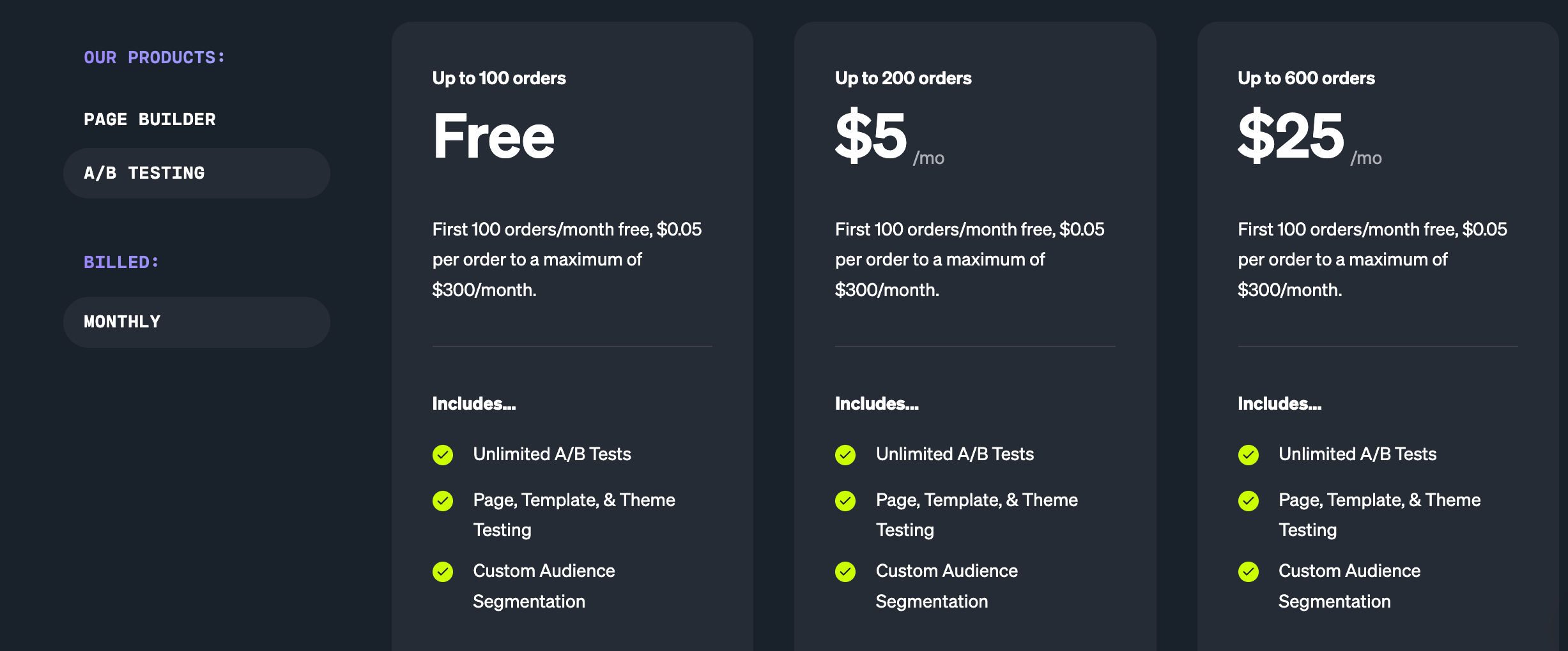 The platform now offers standalone A/B testing functionality—with pricing based on monthly order volume, not just tracked users (MTUs) like in their higher-tier Page Builder plans.