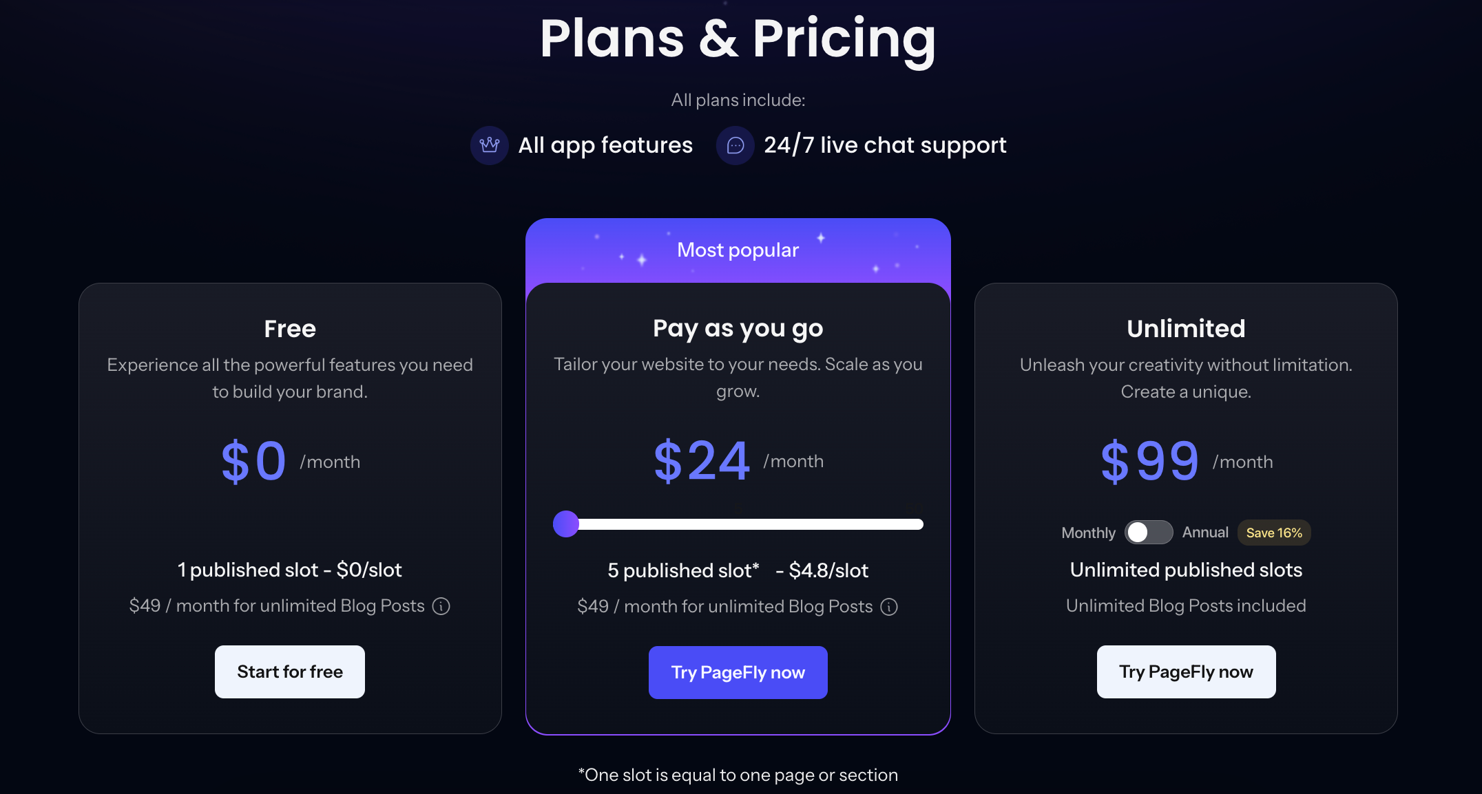 All plans provide access to PageFly's full feature set, including its intuitive drag-and-drop editor, extensive template library, and seamless Shopify integration. The primary differences lie in the number of published slots and the level of support and additional services offered.