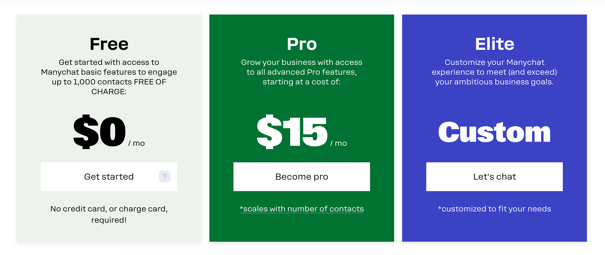 | Free | $0 | Up to 1,000 contacts, Messenger tools, broadcast messaging, limited flows |