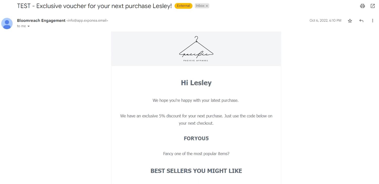Example: Inside tools like Bloomreach, you can build a campaign that sends personalized emails to buyers who purchased 14 days ago, giving them a voucher for their next purchase.