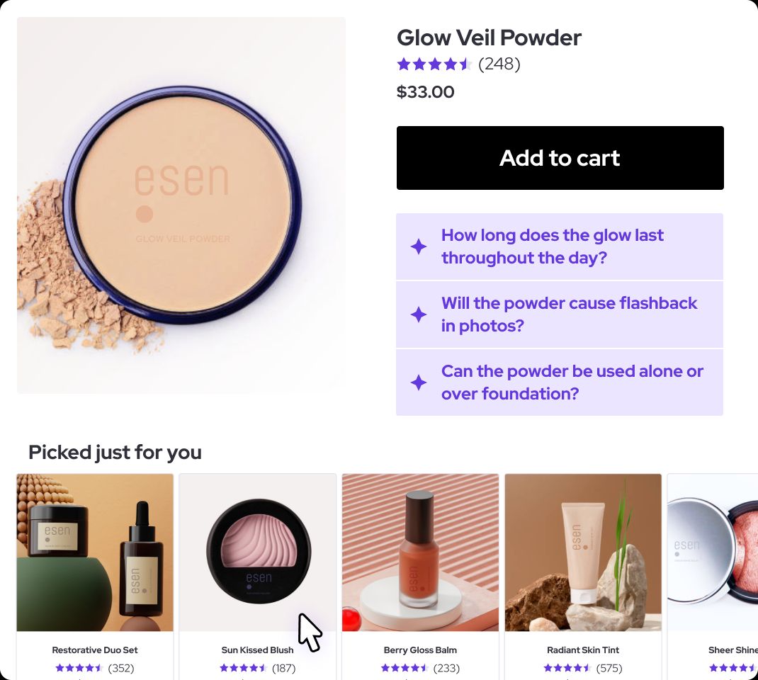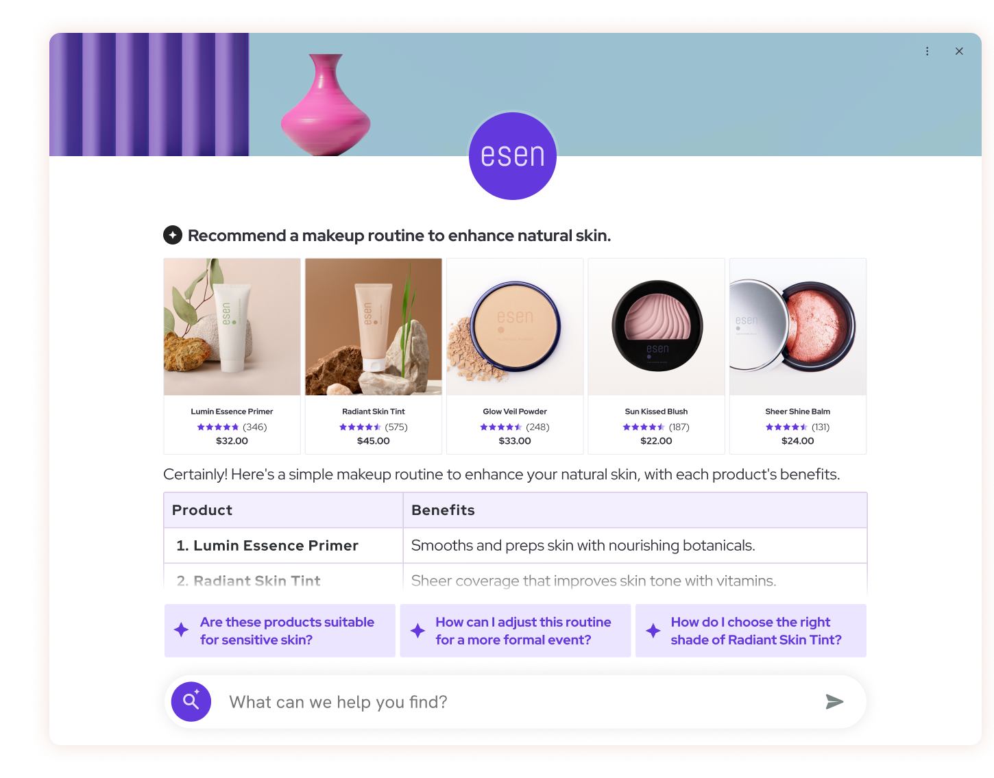 Another example is Esen, a skincare brand that set up Big Sur AI to help their customers customize a skincare routine for their needs:
