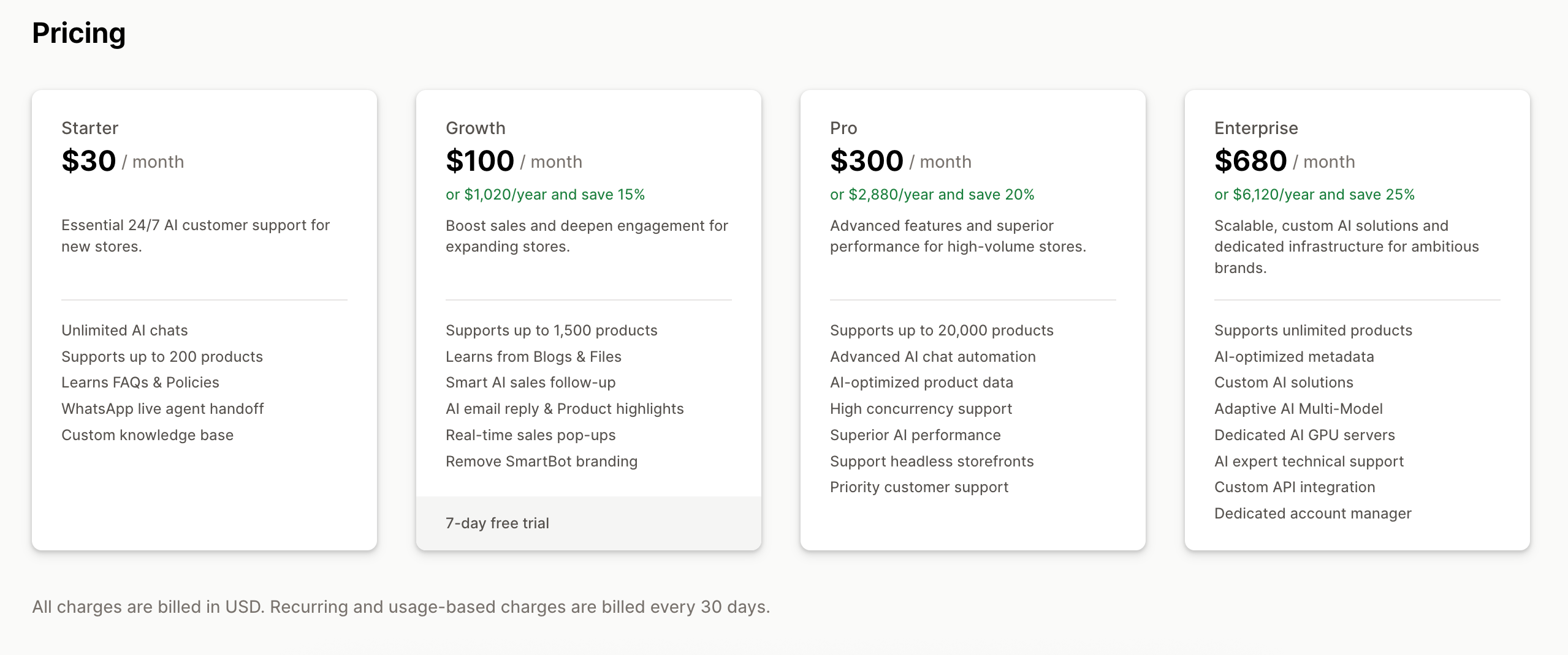 SmartBot charges customers monthly based on the number of chatbots, monthly interactions, and available features.