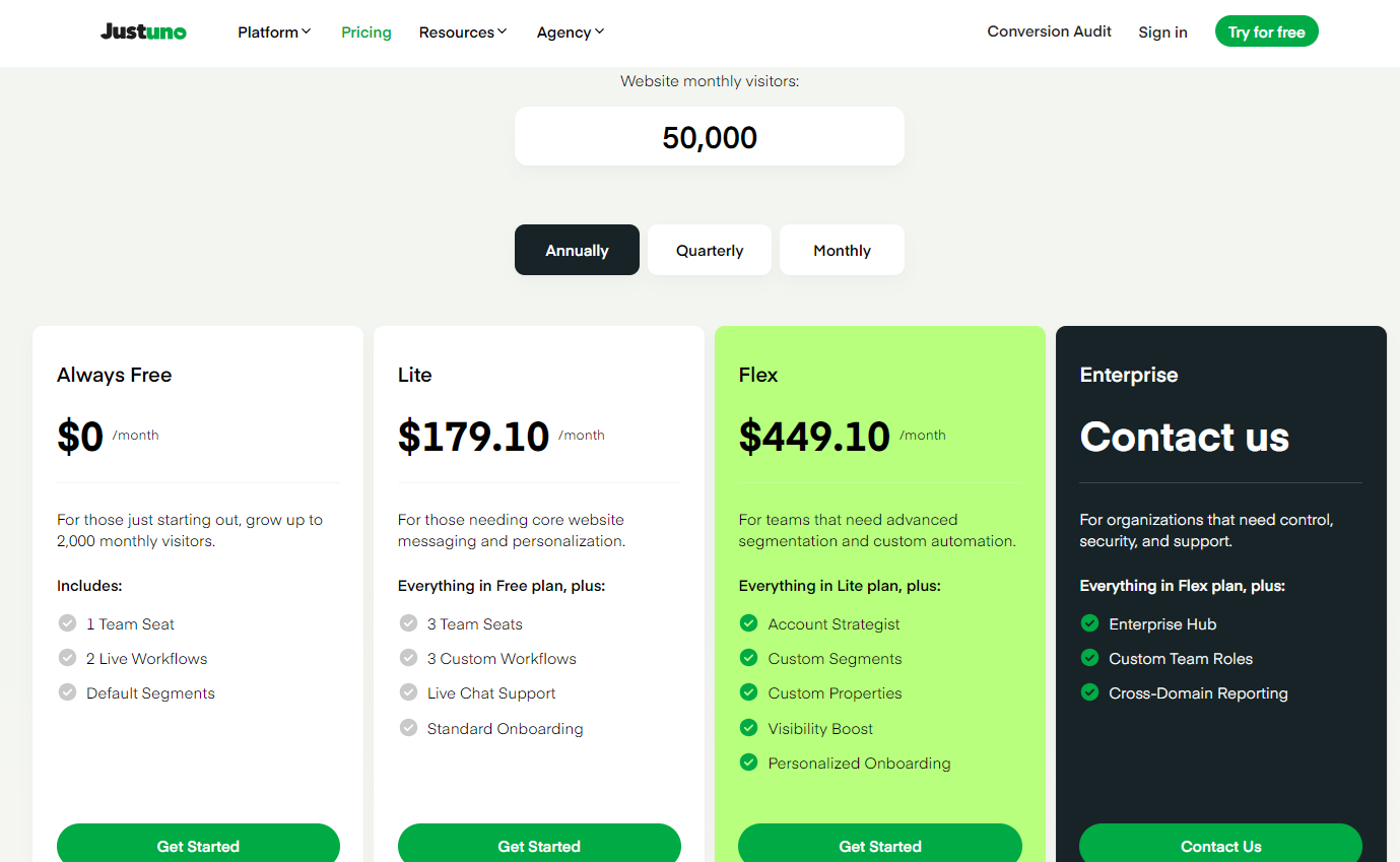 ➡️ Justuno lets you optimize your website with personalized messaging, A/B testing of landing pages, and pop-ups. Pricing is based on monthly website visitors.