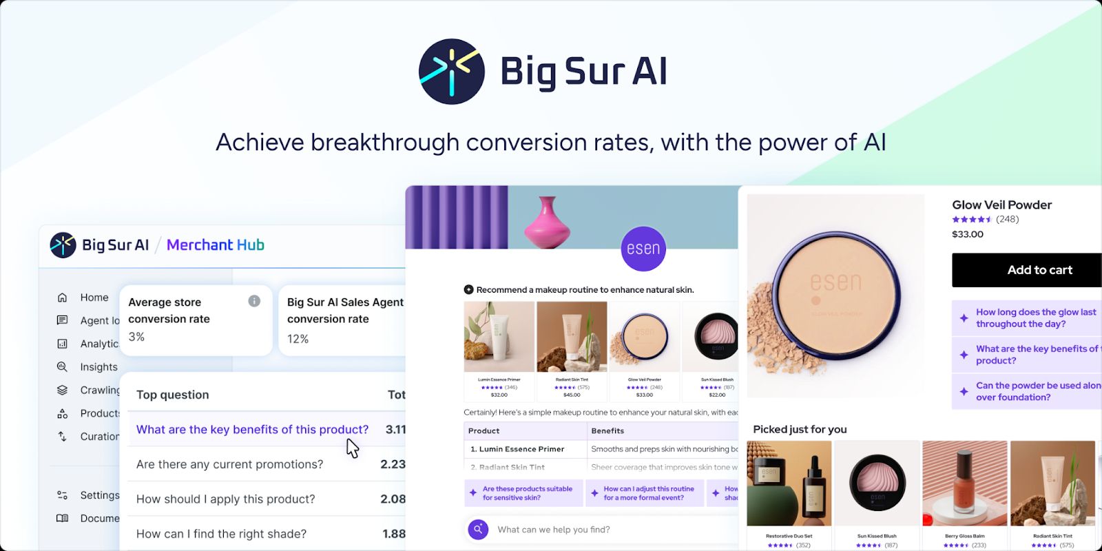 Big Sur’s Conversion-Optimized AI Prompts nudge your shoppers to start more conversations, increasing conversions and basket sizes.