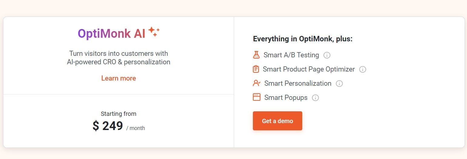 Note: OptiMonk AI also allows you to access the tool's smart A/B testing, smart product page optimizer, and smart personalizations for $249/month.