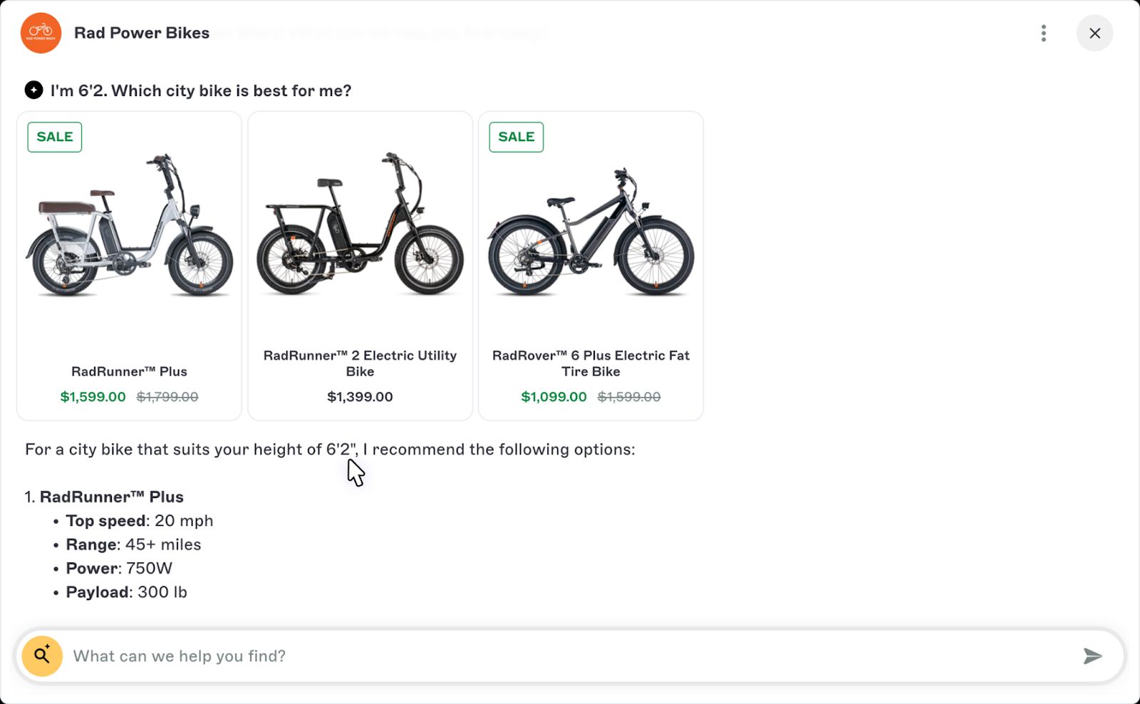 Here's an example from Rad Power Bikes if you ask the sales assistant to recommend a bike for a height of 6'2 ⤵️
